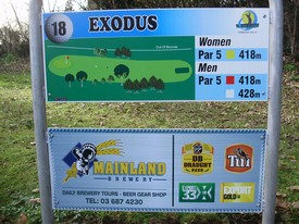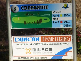 A feature hole on the course. No problems if you hit a straight shot on this mid length Par 3 but the 2 poplar trees demand accuracy. A shot going left will end up down the slope and an unsighted 30 to 50m shot back to the green and macracarpas and then bunkers protect the right side of the green. The green is sloped towards the bunkers so if you hit the mid right side of the green you will run off into the fringe but will have uphill putts. Plenty of tricky putts on this green