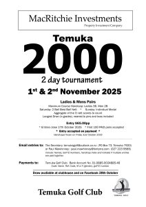 The Temuka Golf Club offers a tidy parkland course that whilst not overly long, which many see as a positive aspect, it provides an interesting challenge for all players. The Temuka Golf Club course is known for its flowering and foliage colour in spring and autumn. Fairways, tees and greens are under irrigation which is controlled by a automated computer system and the course is maintained with a modern fleet of mowers, all with groomers. Visitors are welcome for play at there leisure or in club competitions. The club also welcomes new members.