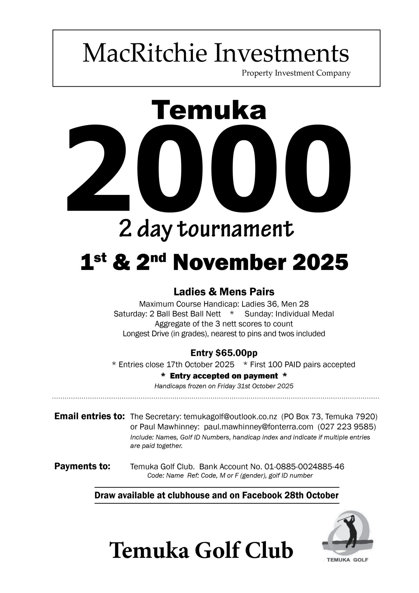 Temuka is 140km south of Christchurch and a gateway to the South Island lakes district and to Queenstown, Oamaru and Dunedin. The Temuka Golf Club is on Domain Avenue on the right past the Temuka Domain. Directions to the club are on the google map at the bottom of this page.
